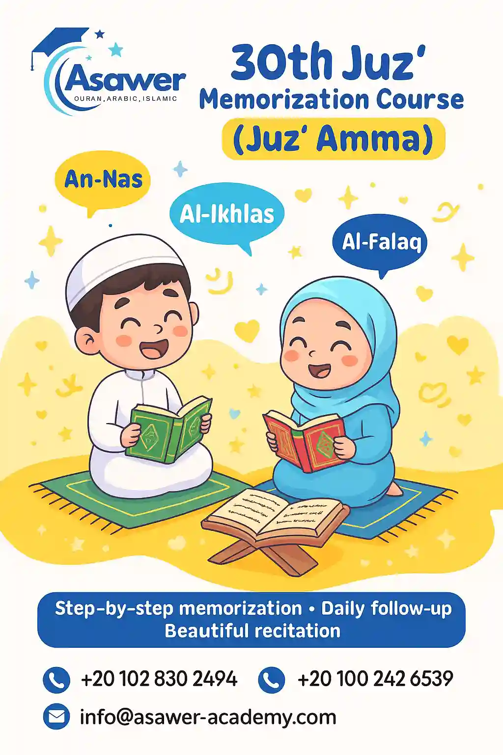 - The 30th Juz’ (Juz’ Amma) is often the first section of the Quran that students memorize. This course focuses on memorizing these shorter chapters with correct pronunciation, beautiful Tajweed, and accurate recitation. Led by certified native Arab teachers, each lesson is structured to help students of all ages (children and adults) memorize efficiently. Teachers provide personalized strategies and techniques, such as repetition and breakdowns of verses, to make memorization easier and more effective. Students will gradually build their memorization skills and recite with confidence and precision.