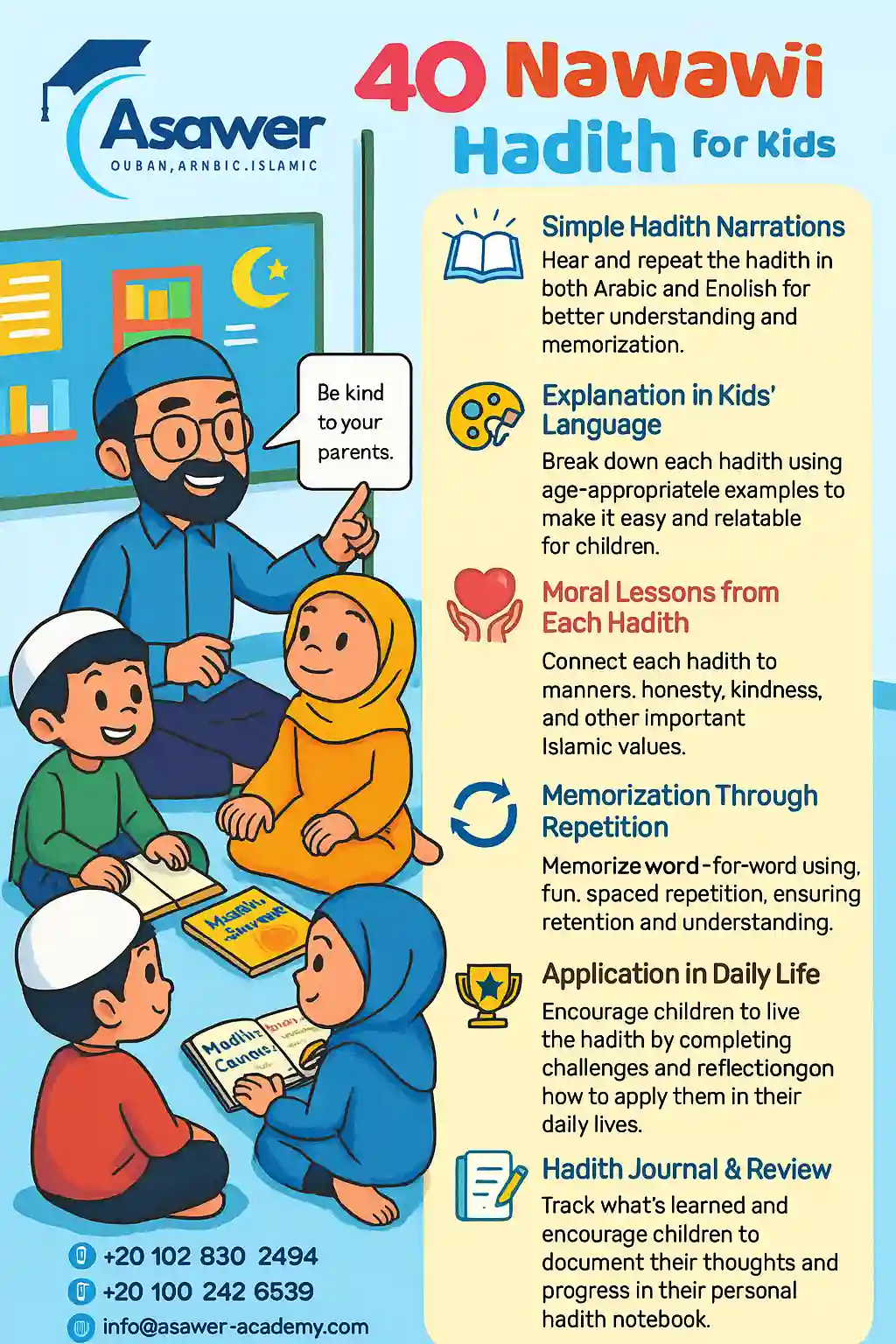 - Explanation in Kids’ Language – Break each hadith down using age-appropriate examples.