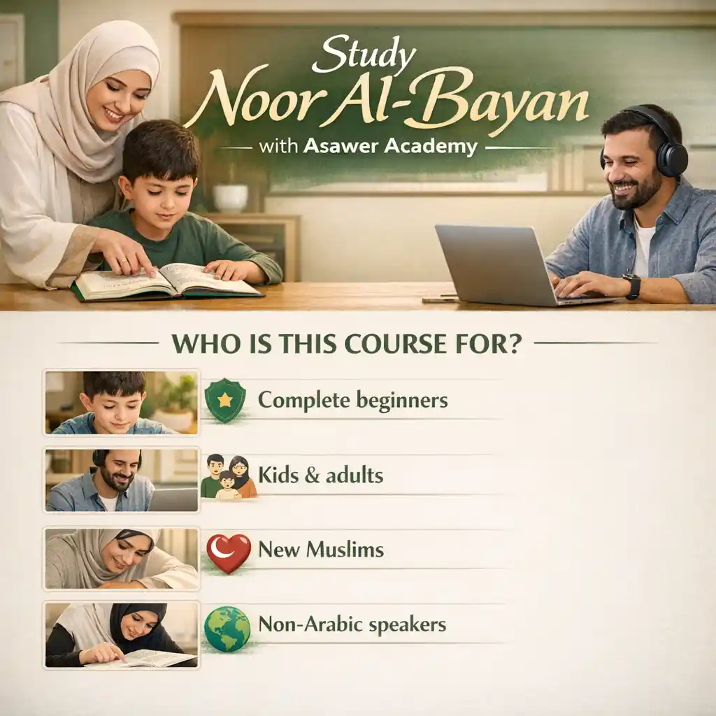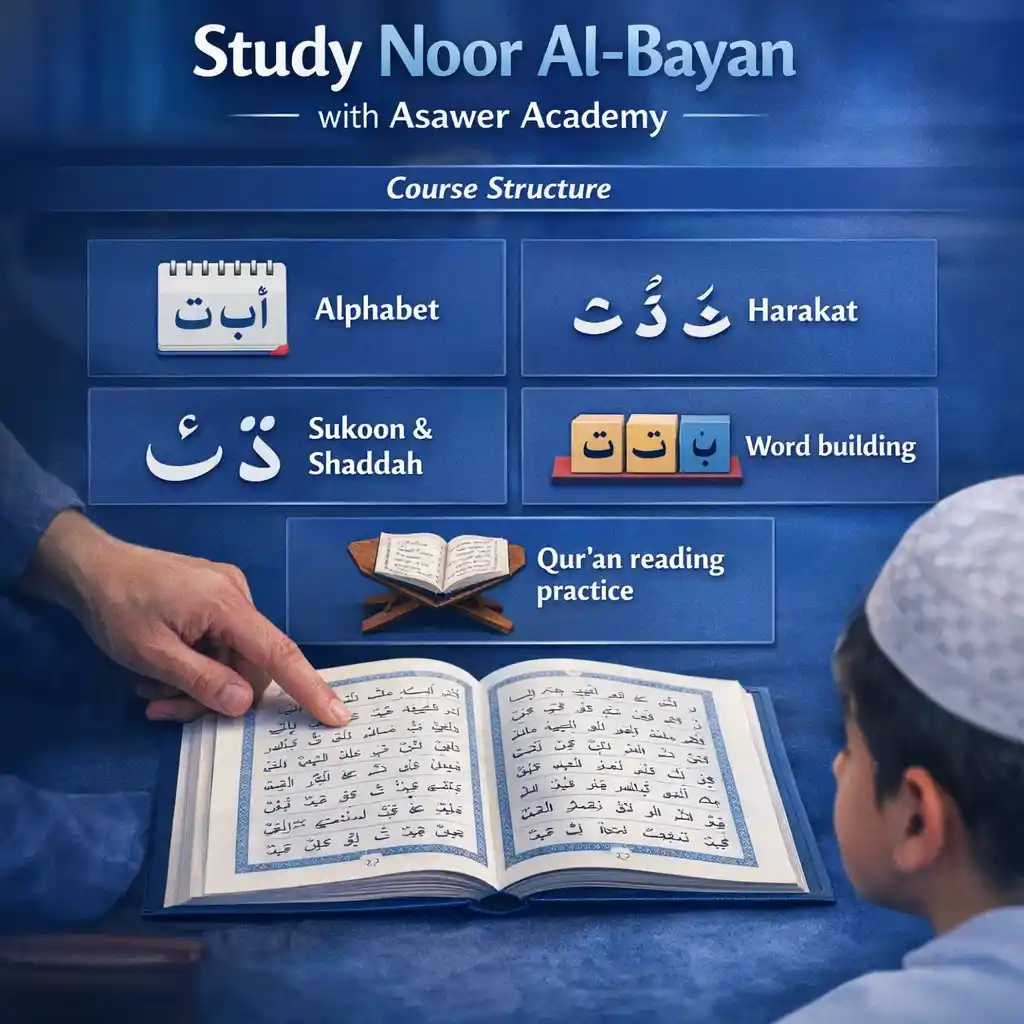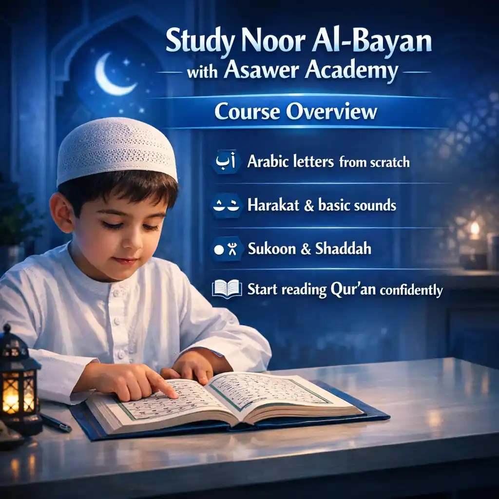 Learn Quran reading from the very beginning using the famous Noor Al-Bayan method—step by step, with clear pronunciation training and gradual progression. This course builds a strong foundation in Arabic letters, harakat, tanween, sukoon, shaddah, and correct articulation points, so you can confidently start reading Qur’an with accuracy and ease.